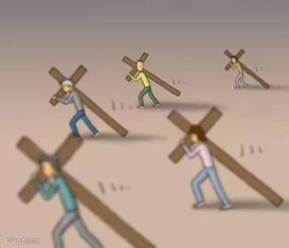 第一幅漫画中,每个人都背负着一个沉重的十字架,在缓慢而艰难地前行。