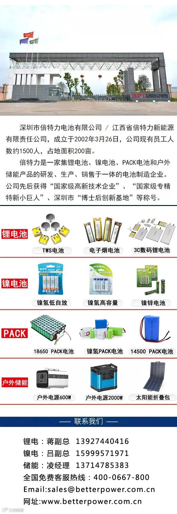 公司产品由以前的镍氢电池单一产品,发展到“镍氢、锂电、储能电源”三个事业部,销售客户遍布全世界各地;逐步由一家默默无闻的小企业,成长为一家电池和新能源领域的“深圳知名品牌、广东省著名商标、国家级专精特新小巨人企业、并连续五次荣获中国发明专利优秀奖”的生产、销售、研发一体化的国家级高新技术企业,一系列的荣誉。稳步前行,我们一直在进步,并已在行业内具有一定影响力。