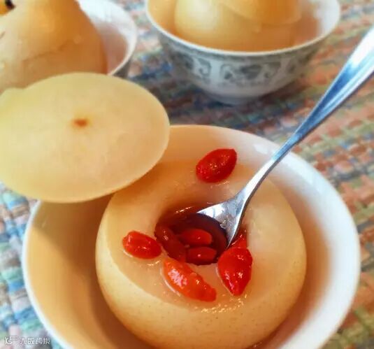 食疗用法:先将雪梨削去外皮,用器具磨成茸状或者切成数块,加冰糖少许,清水适量,慢火蒸半个小时即可。这还是一道非常好吃的甜品。