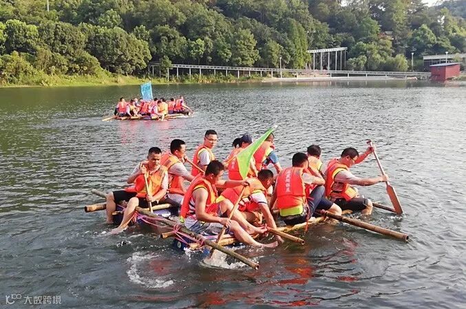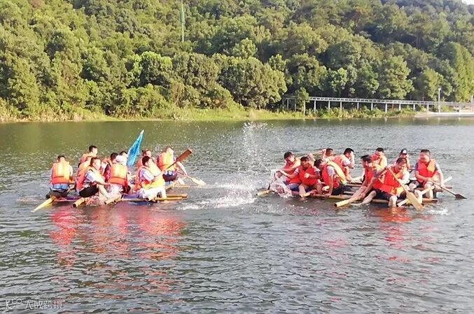 《扎筏泅渡》队伍所有的队员在规则限制内利用油桶、竹竿等物资制作一艘竹筏,最后所有人齐心协力把竹筏划到指定地点完成任务。