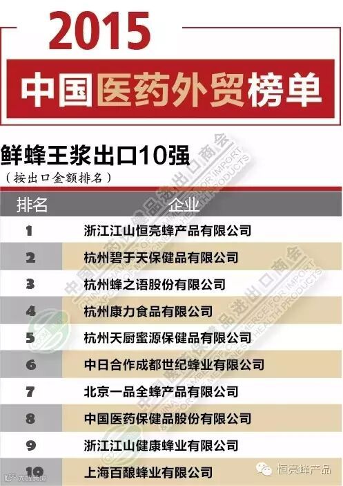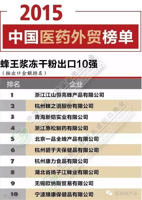近日,中国医药保健品进出口商会公布了2015年蜂王浆类产品出口10强企业名单。在此名单中,浙江江山恒亮蜂产品公司再次名列2015年度中国鲜蜂王浆和蜂王浆冻干粉的出口榜单前列。而事实上,从2007年开始,恒亮蜂产品公司已经连续9年牢牢占据了此排名榜单的这一位置。