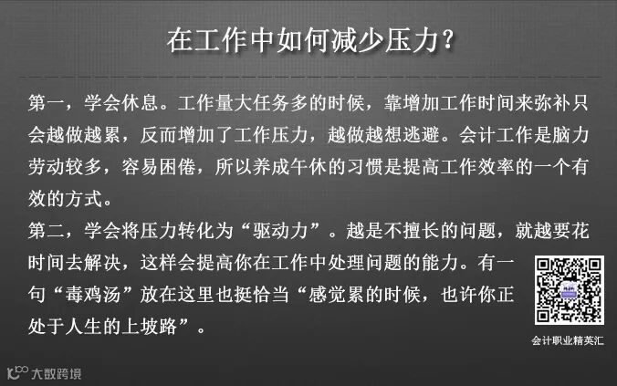 这一篇给大家提供了两个应对压力的建议,在工作中一定要进行实践,我身边的会计朋友在经过一段时间的实践之后,她的反馈是:最明显的变化就是不再恐惧上班了。那相信不久以后,很多有压力的朋友都可以“跳着踢踏舞去上班”了,好了,这一篇的内容到这里就结束了,你在工作中有遇到过给自己带来压力的问题吗?你最后又是如何面对的呢!
