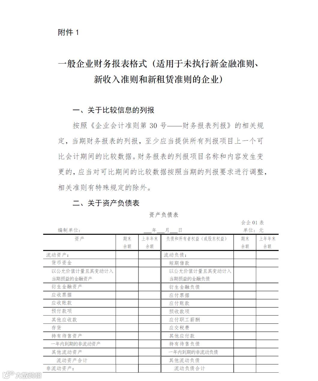 为解决执行企业会计准则的企业在财务报告编制中的实际问题,规范企业财务报表列报,提高会计信息质量,针对2019年1月1日起分阶段实施的《企业会计准则第21号——租赁》(财会〔2018〕35号,以下称新租赁准则),以及企业会计准则实施中的有关情况,我部对一般企业财务报表格式进行了修订,现予印发。本通知适用于执行企业会计准则的非金融企业2019年度中期财务报表和年度财务报表及以后期间的财务报表。