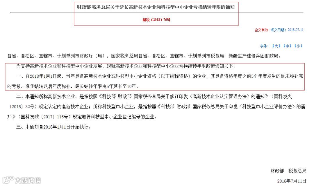财税〔2018〕76号 ,为支持高新技术企业和科技型中小企业发展,现就高新技术企业和科技型中小企业亏损结转年限政策通知如下: