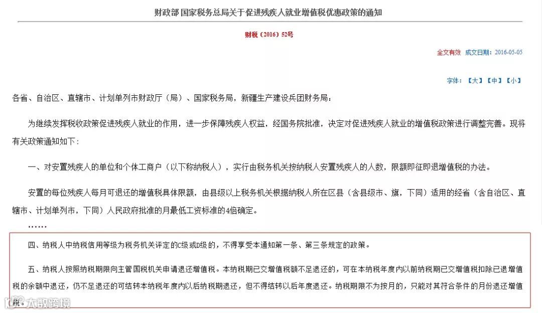 答:根据《财政部 国家税务总局关于促进残疾人就业增值税优惠政策的通知》(财税〔2016〕52号)第四条规定,纳税人中纳税信用等级为税务机关评定的C级或D级的,不得享受本通知第一条、第三条规定的政策。