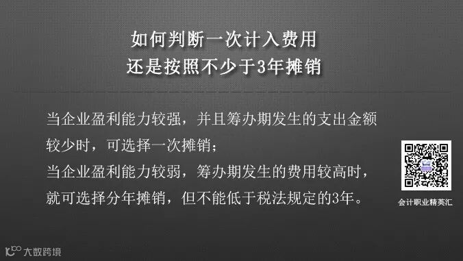 比如企业盈利能力较强,并且筹办期发生的支出金额较少,就可以选择一次摊销,如果企业盈利能力较弱,筹办期发生的费用较高,就可以选择分年摊销,但不能低于税法规定的3年。