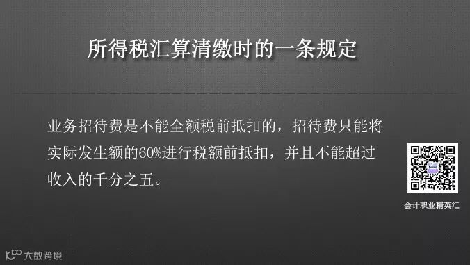 我们在处理所得税汇算清缴的时候有一条规定:业务招待费是不能全额税前抵扣的,招待费只能将实际发生额的60%进行税额前抵扣,并且不能超过收入的千分之五。