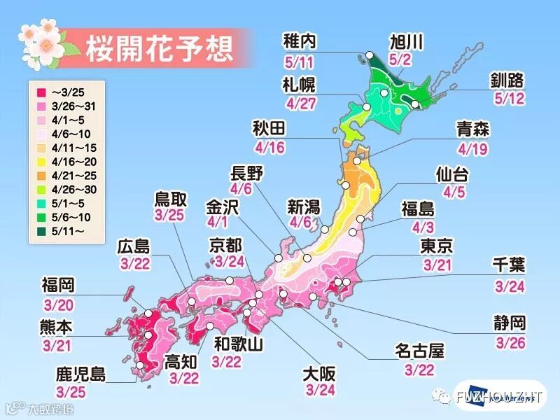 樱花在前一年的夏天,花芽就会形成且进入休眠状态,直到冬天在一定期间的低温环境影响下,花芽才会从休眠状态中苏醒过来,然后随着气温的上升成长至开花。其实它的美丽绽放从前一年秋天的气温变化开始,到开花日为止都不停的受到影响。而一般来说,经过晚秋、冬天开始的寒冷到春天来临的这段期间,气温越高的话,花就会开的越早。当然根据品种的不同,有些樱花可能会提早一点开,有些
