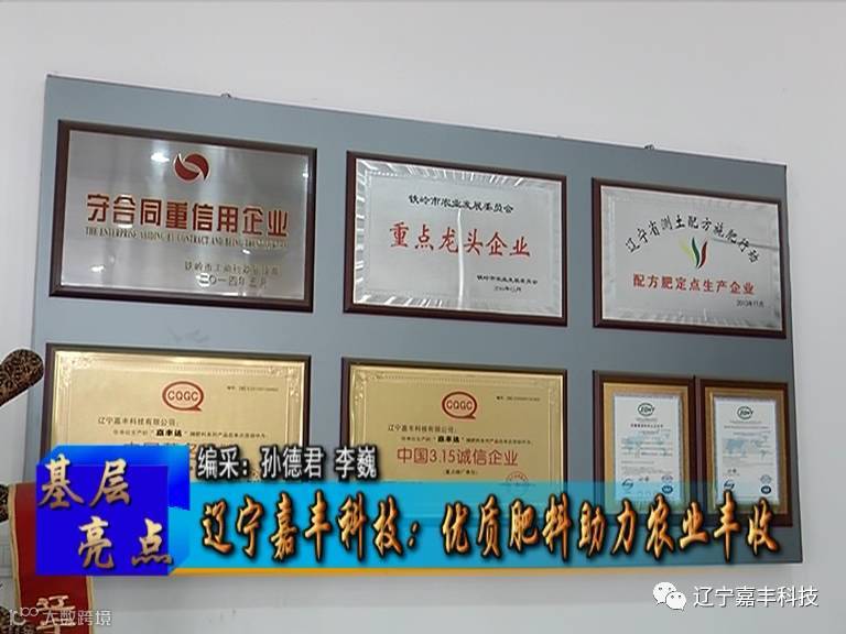 辽宁嘉丰科技有限公司以“诚信赢天下”为宗旨,通过多年坚持不断的努力,获得了政府和市场的认可。目前企业已通过ISO9001质量体系认证,并分别被评为铁岭市“3.15”诚信企业,铁岭市“重合同、守信用”企业,铁岭市行业“龙头企业”;辽宁省测土配方施肥定点生产企业。产品“嘉丰达”被评为中国著名商标。