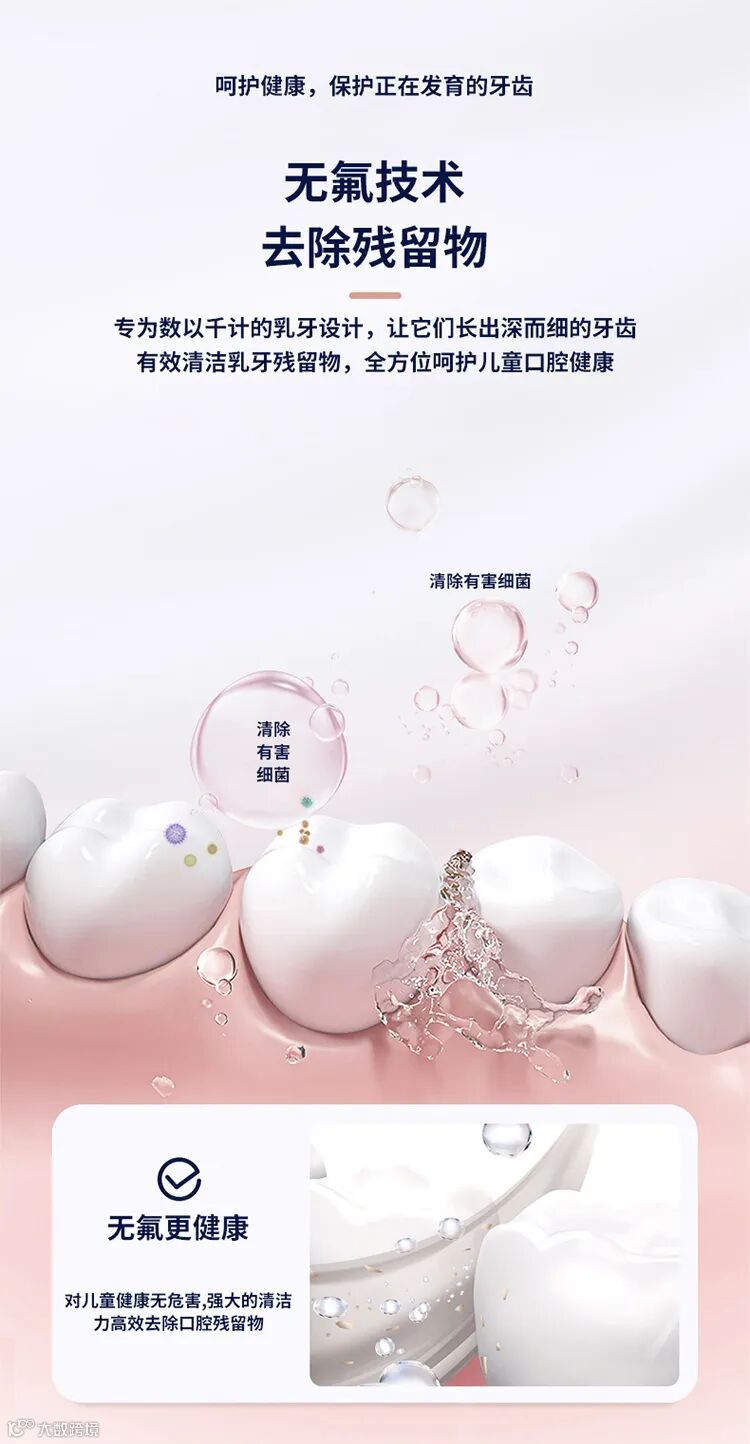 专为数以千计的乳牙设计,让它们长出深而细的牙齿有效清洁乳牙残留物,全方位呵护儿童口腔健康。
