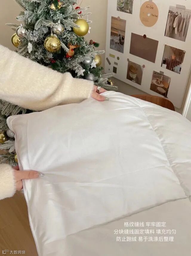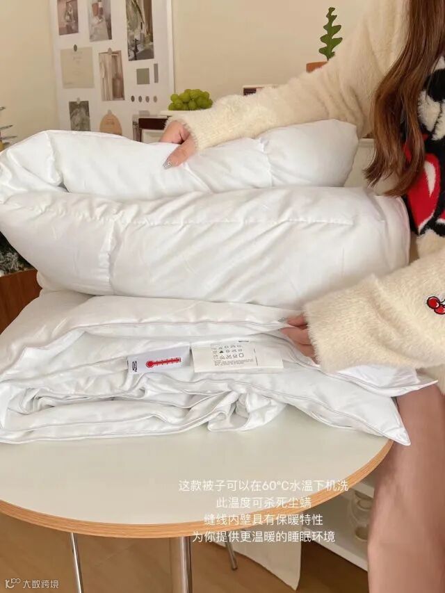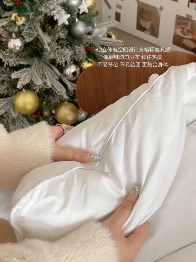 柔软的棉质布料与蓬松羽绒填料具有良好的透气性和吸湿性!让您整晚享受宜人温度!面包立体仓式缝制具有保暖特性、为您提供更温暖的睡眠环境!