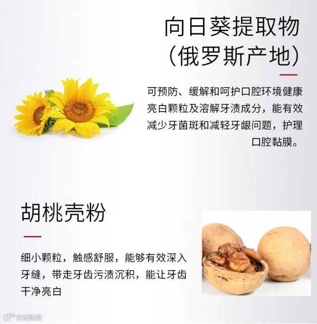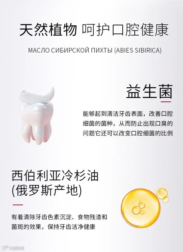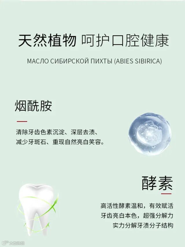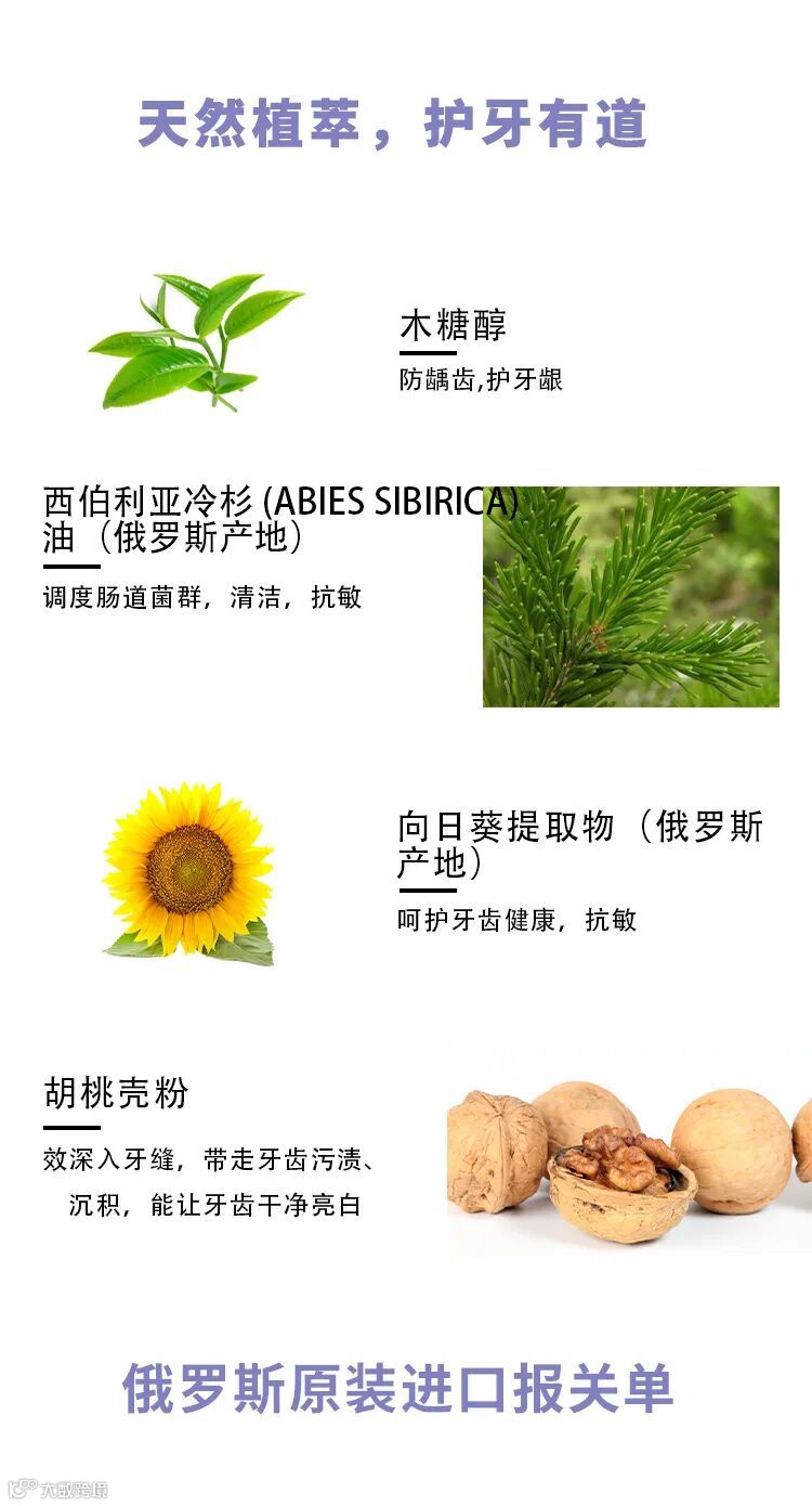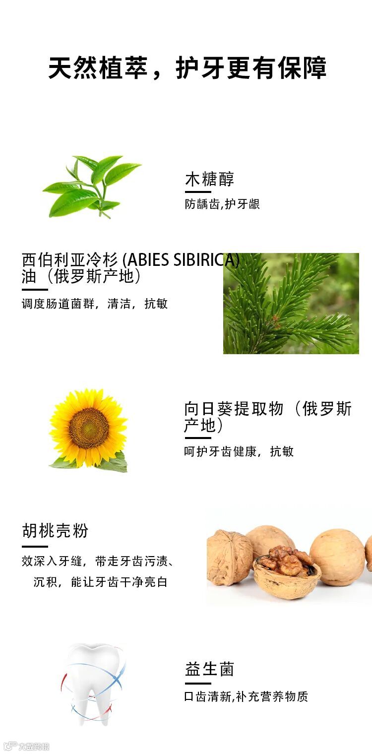 天然配方:木糖醇(强健牙齿)益生菌酵素、(杀菌,保护牙釉质)西伯 利亚冷杉 (ABIES SIBIRICA)油、(抗敏、改善牙齿出血)(俄罗斯产地)向日葵(HELIANTHUS ANNUUS)提取物(消炎、保护牙齿健康)(俄罗斯产地)胡桃壳粉(清洁)