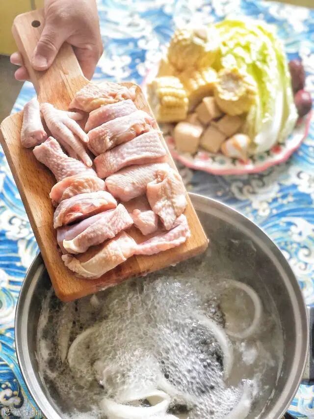 煮沸后,下鸡肉