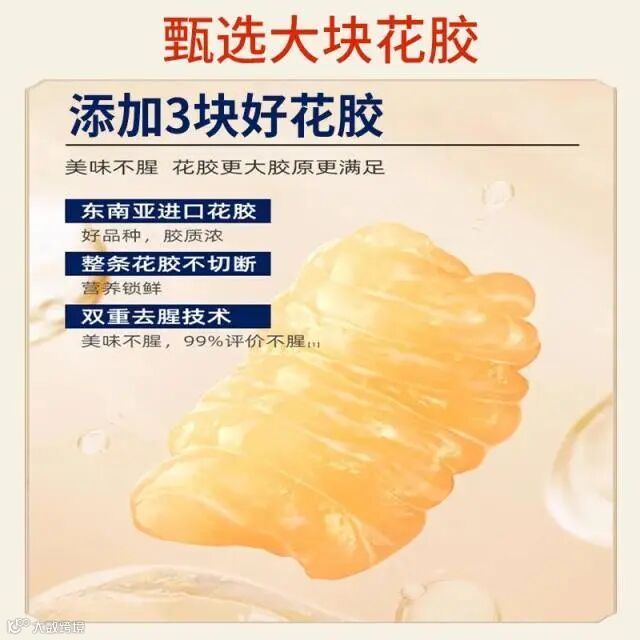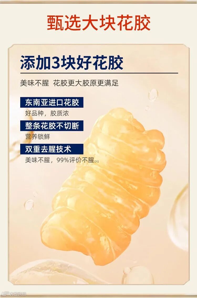 卫生:原瓶炖煮 不与空气接触产生污染92-95度恒温炖煮 保留花胶营养