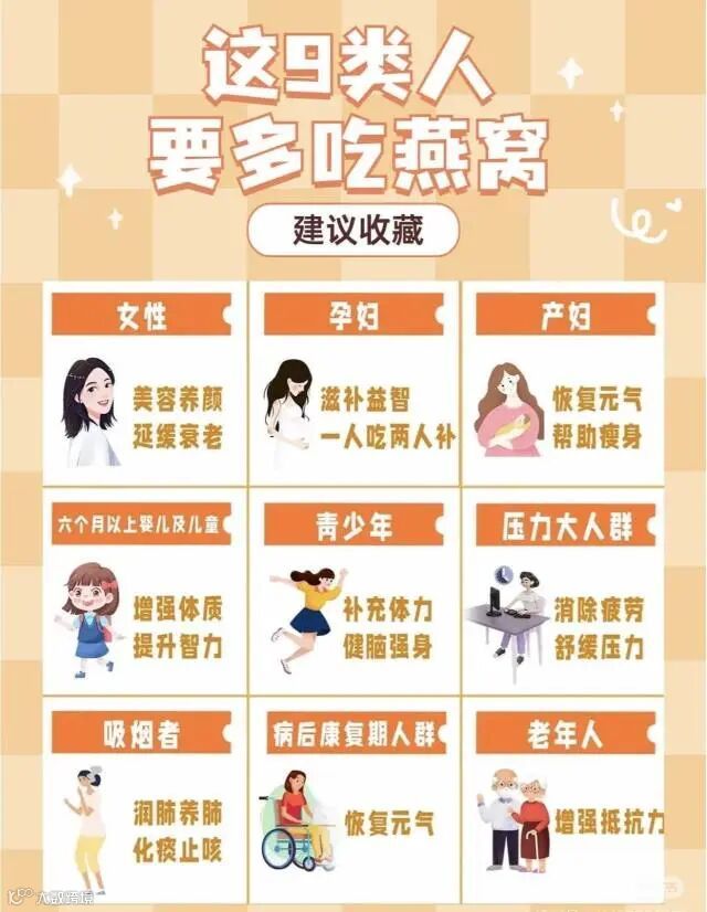 孕妇,燕窝中的燕窝酸能促进胎儿脑部发育,还能滋养肌肤。