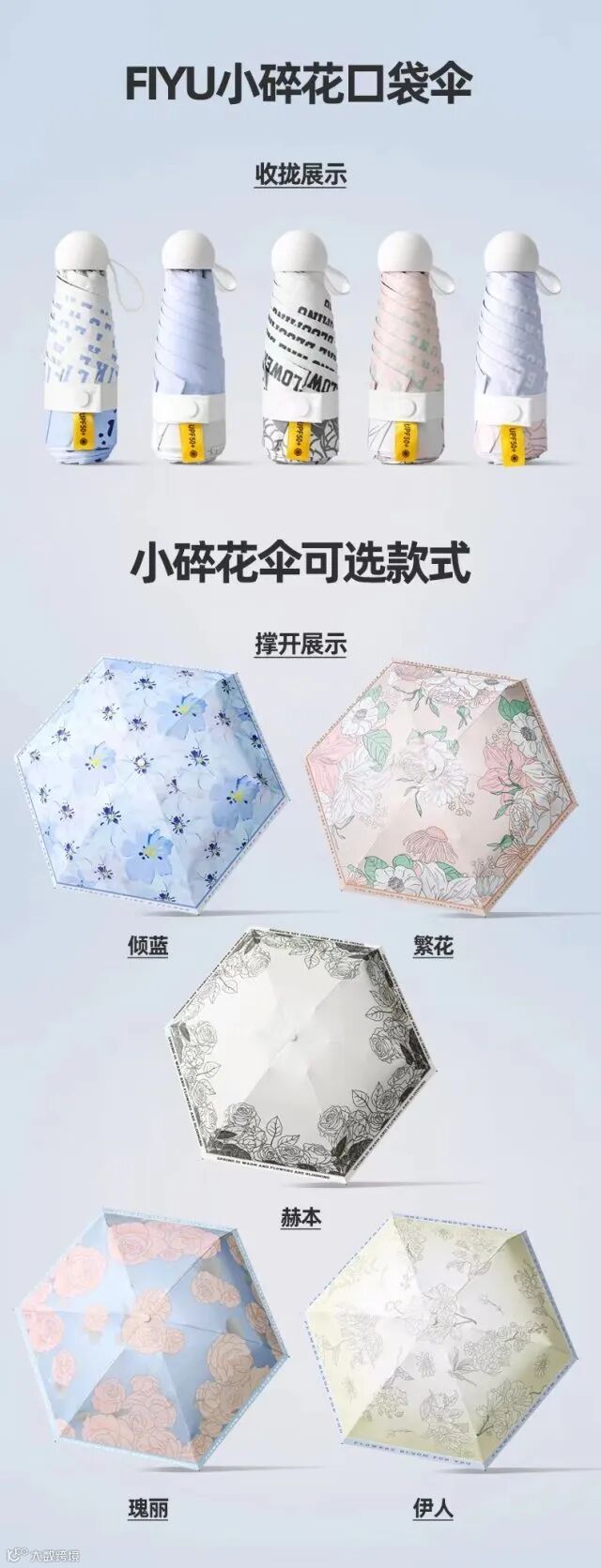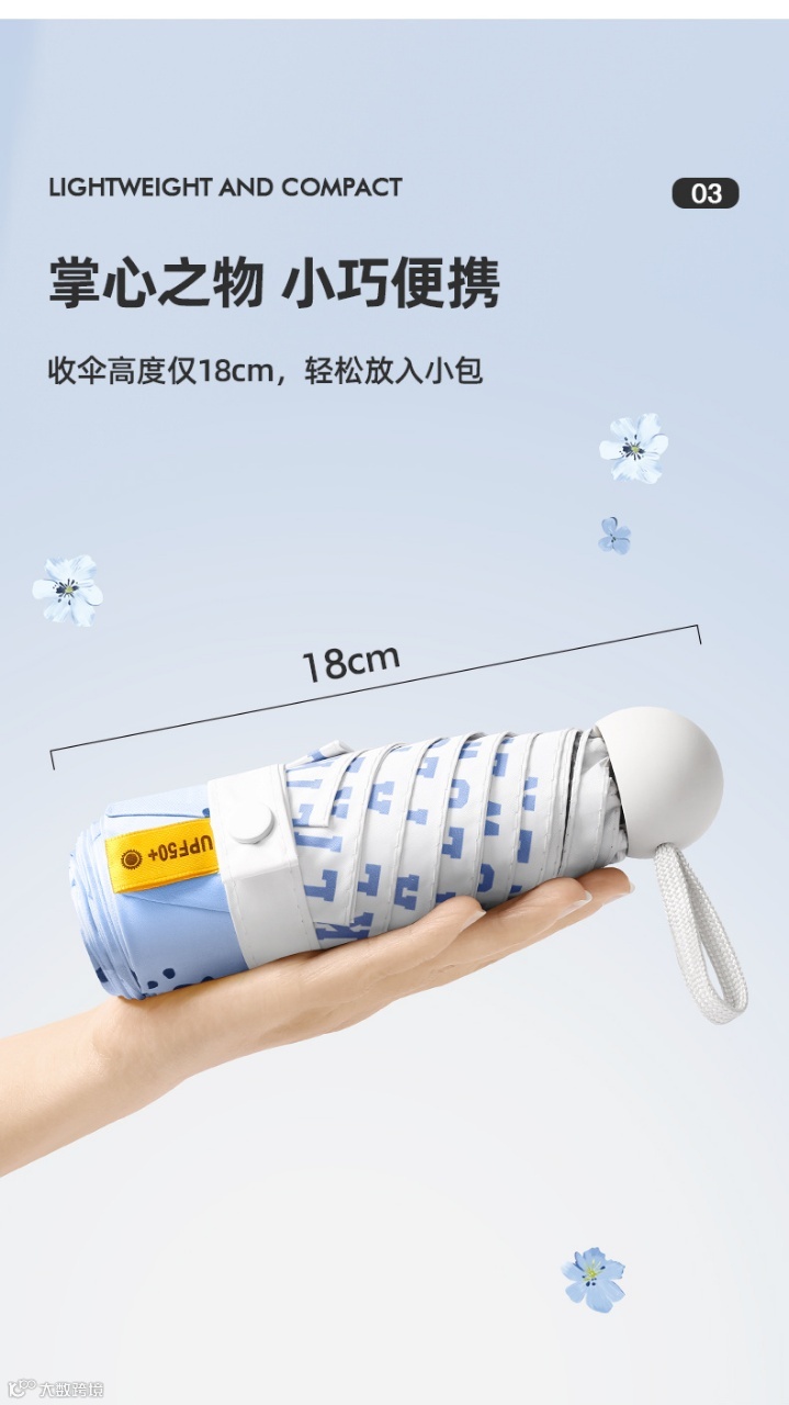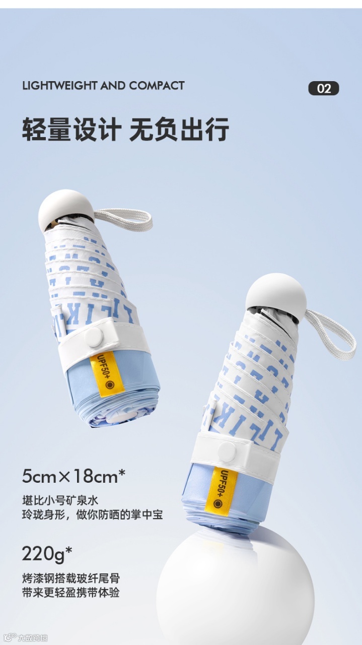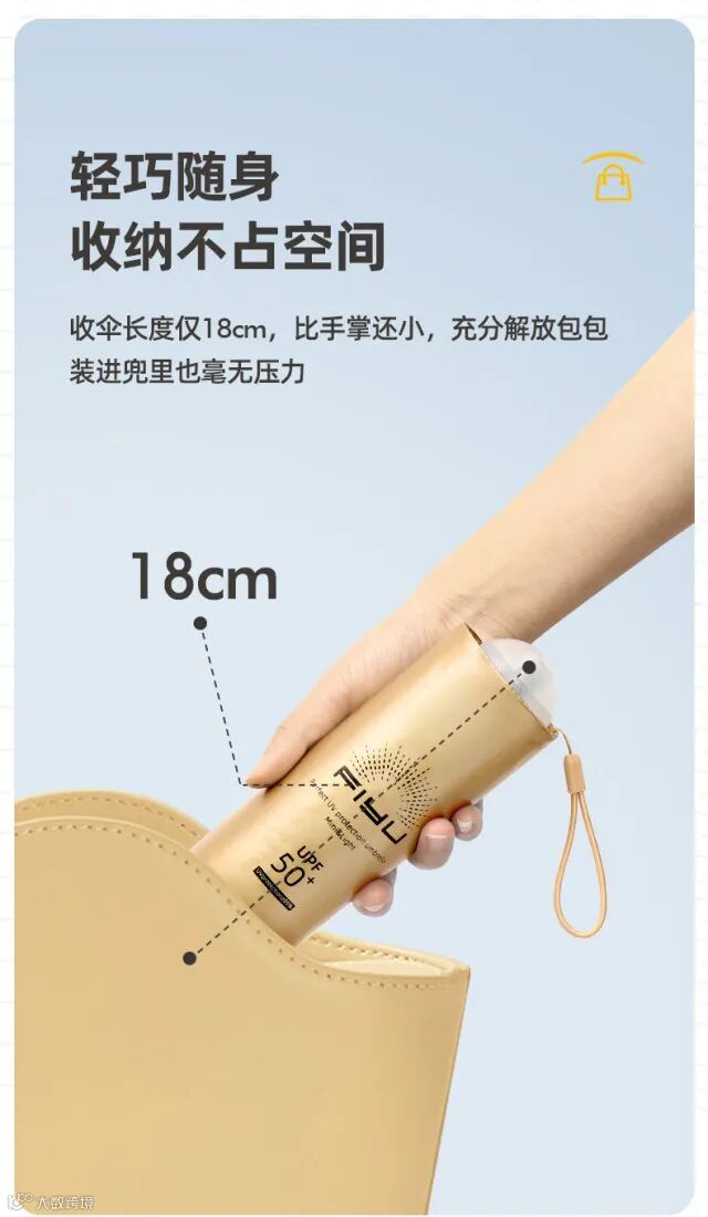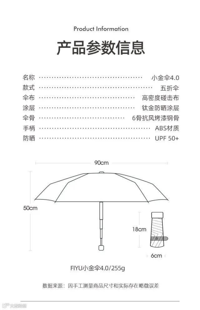FIYU小金伞4.0是精心设计的至小至轻之作,将尺寸和质量做到了极致 。收伞高度仅18cm,比手掌还小;轻重约255g,比一个苹果还轻 。小的雅致,轻的灵活,能充分解放你的包包,装进兜里也毫无压力,让你轻松出行 ~