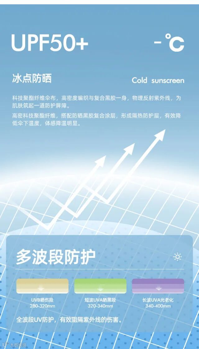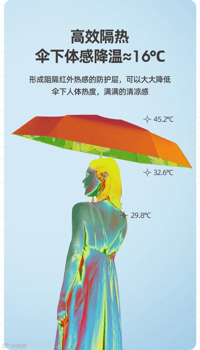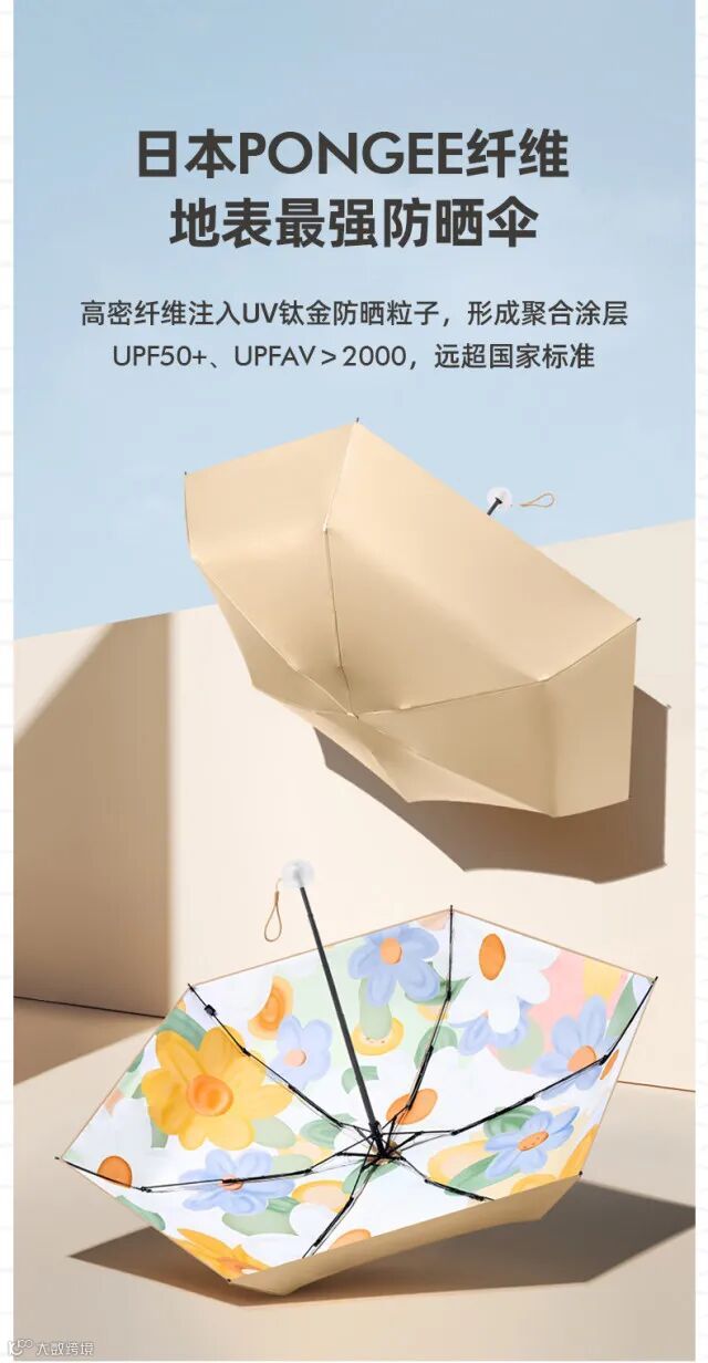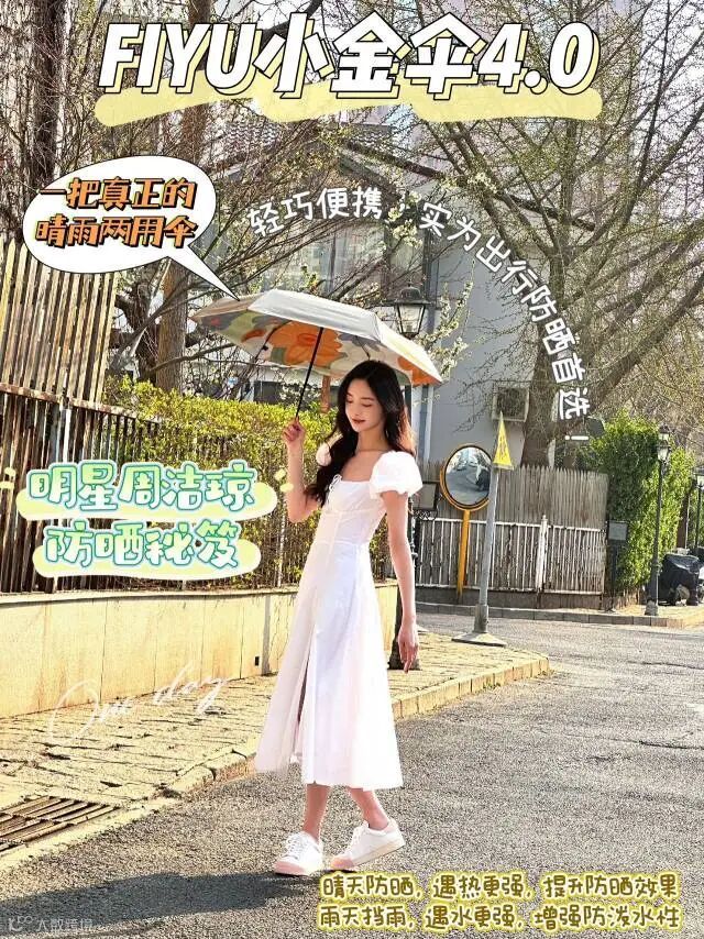 FIYU。小金伞4.0是FIYU联合 日本国立材料实验室共同研发而出的宇航级防晒伞,在此前小金伞的基础上大大提升了防晒能力。使用了最新独创的钛金防晒涂层,具有“遇热更强”的黑科技特性,当外界温度越高,涂层里的微小分子越是紧密聚合,从而形成更强有力的遮光层,可以大大提升紫外线防护效果,堪称地表最强防晒~