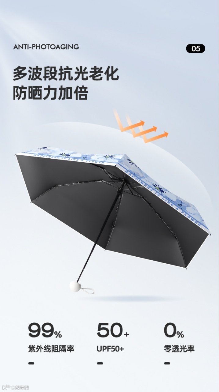 作为防晒伞,自然少不了防晒系数。FIYU小金伞4.0作为地表最强防晒伞,UPF>50、UPFAV >2000,是远远超过国家规定的标准,防护系数更是行业之最;对紫外线的阻隔率≥99%,做到了真正“0”透光,一把伞抵过五瓶防晒霜,想晒黑都难!