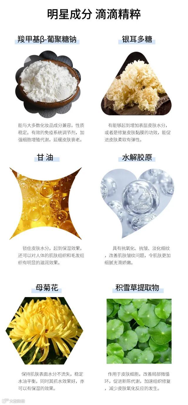 银耳多糖:能起到修复皮肤、增加表层皮肤水分的作用。它能提高角质层的水分,使皮肤更加柔软有弹性。此外,它还能降低水分蒸发的程度,增强皮肤自我保护屏障。