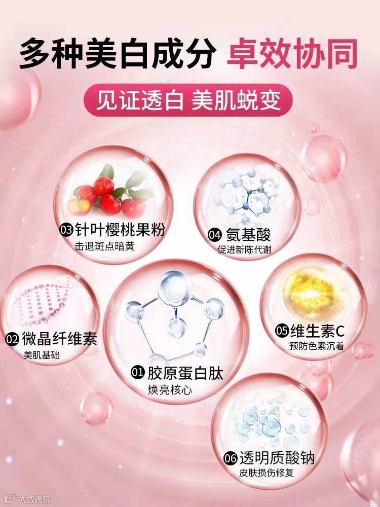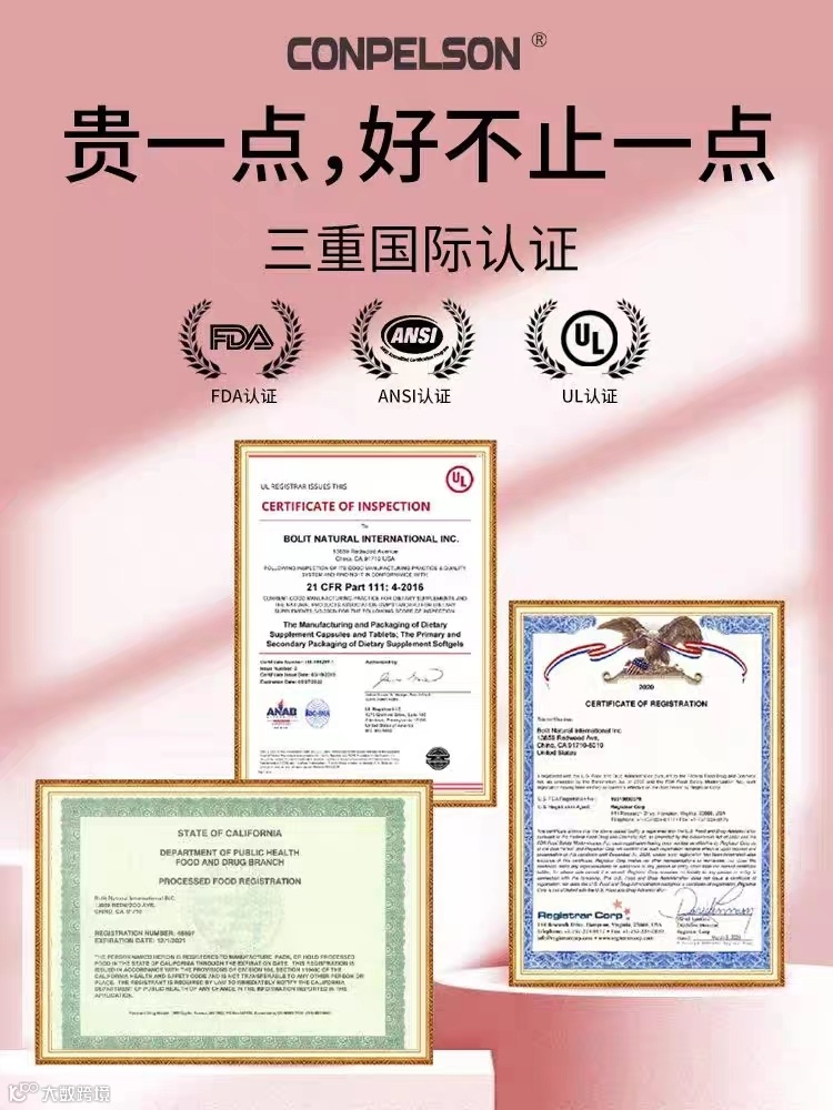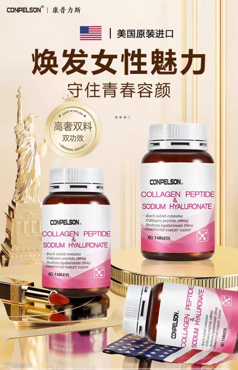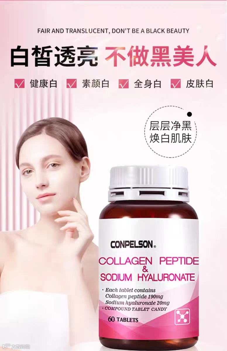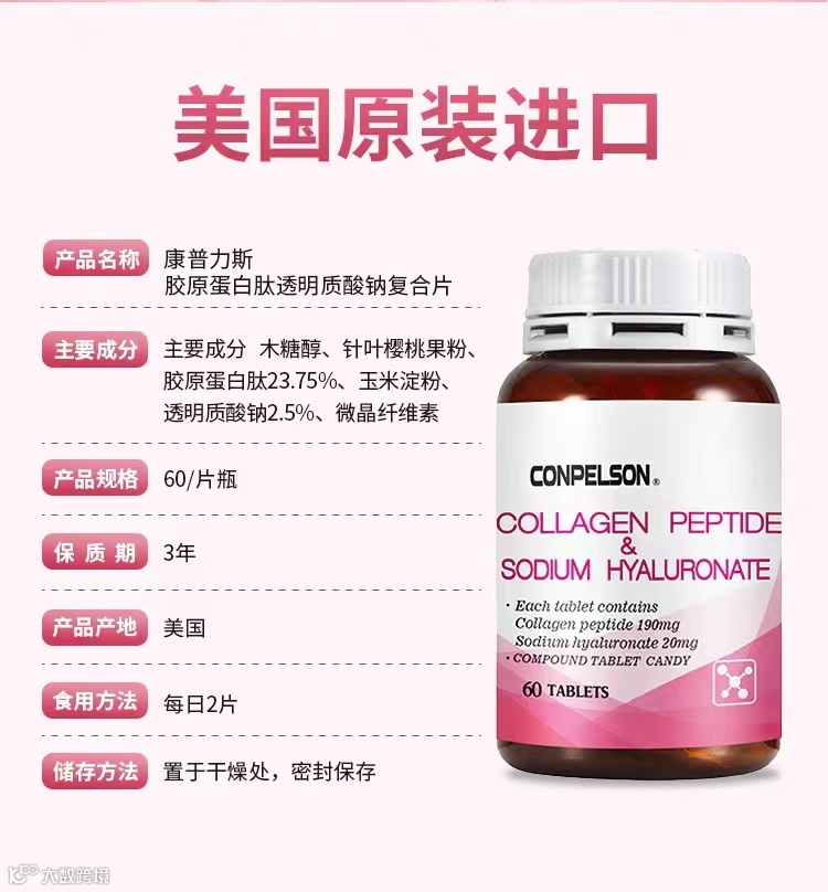 【产品名称】:康普力斯胶原蛋白肤透明质酸纳复合片 【产品类型】:片剂 【产品规格】:60粒/瓶 【主要成分】:主要成分木糖醇、针叶樱桃果粉胶原蛋白肚23.75%、玉米淀粉,透明质酸钠2.5%、微晶纤维素 【保 质 期】:36个月 【用法用量】:每日2次,每次2粒 【产品功效】:延缓衰老,改善松弛,暗沉,增加细胞的弹性,紧致肌肤