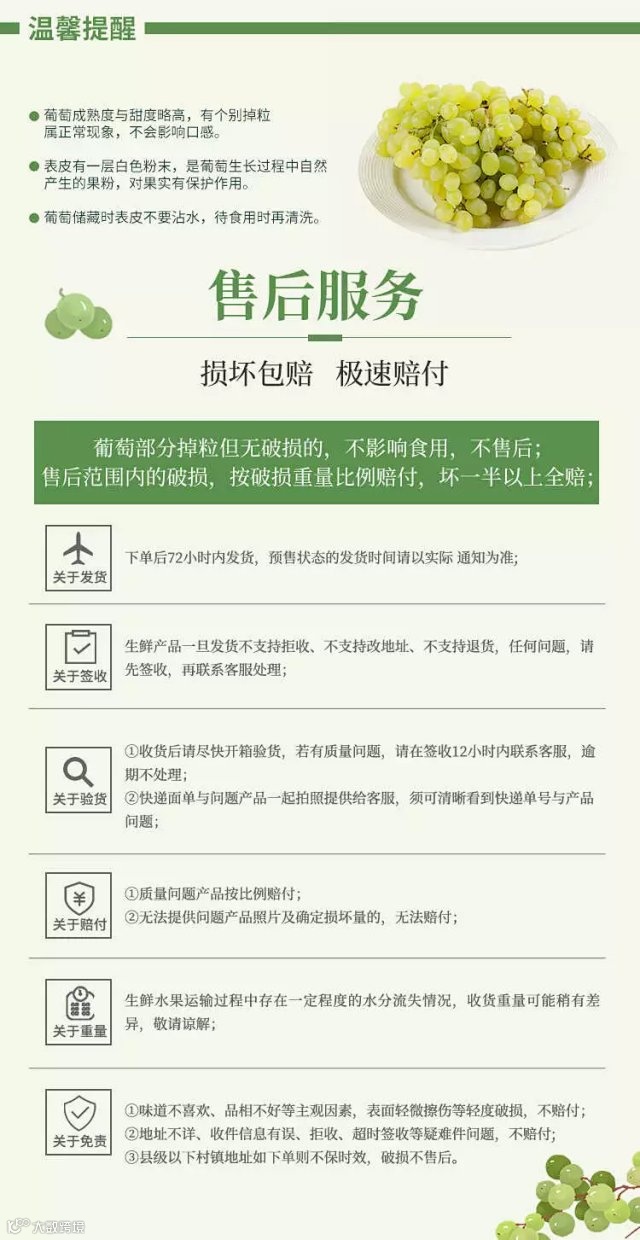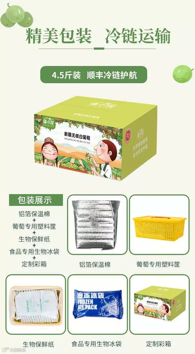 【规格】净重4.5斤 【产地】新疆吐鲁番 【包装】纸箱+保温袋+冰袋+框子 【发货快递】全国6仓就近发货(西安、杭州、东莞、武汉、成都、北京),顺丰冷运,新疆、西藏、海南不发。 ②所有地区的县级以下乡镇包邮不包损。