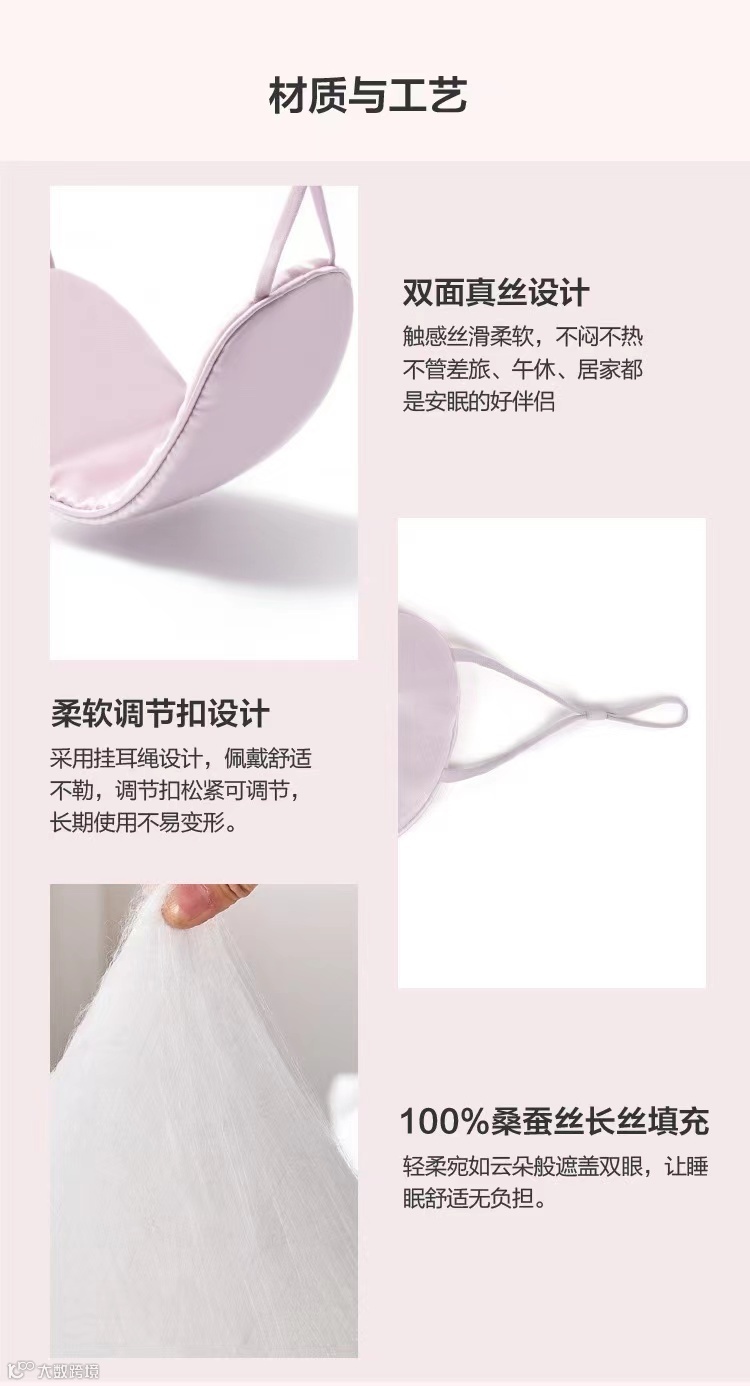 19姆米重磅真丝眼罩 规格:两只装(21*10cm) 颜色:深灰色+深蓝色;浅紫色+夏目绿 产品成分:桑蚕丝 云朵般的感受,极致温柔助您安心睡眠 桑蚕丝眼罩,手工制作而成,舒适感倍增 可调节而挂绳,任何脸型都能佩戴 柔软弹力耳挂,拒绝勒耳