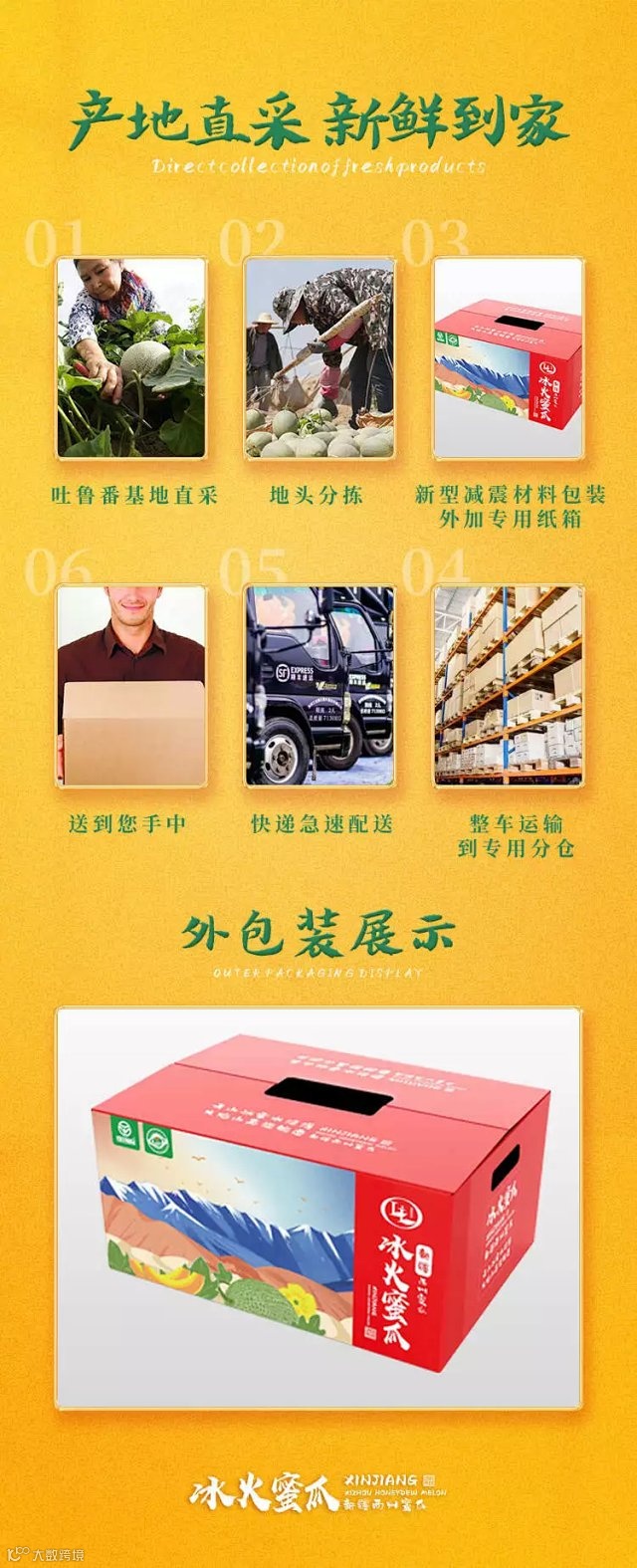【品名】冰火蜜瓜西州蜜 【产地】新疆吐鲁番 【净含量】 8-9斤【贮存条件】通风常温或者冷藏储存 【发货地】吐鲁番/乌鲁木齐/西安随机 【包装方式】网套或珍珠棉+定制包装 【不发货区域】西藏,县级以下村镇地址如下单则不保时效,破损不售后