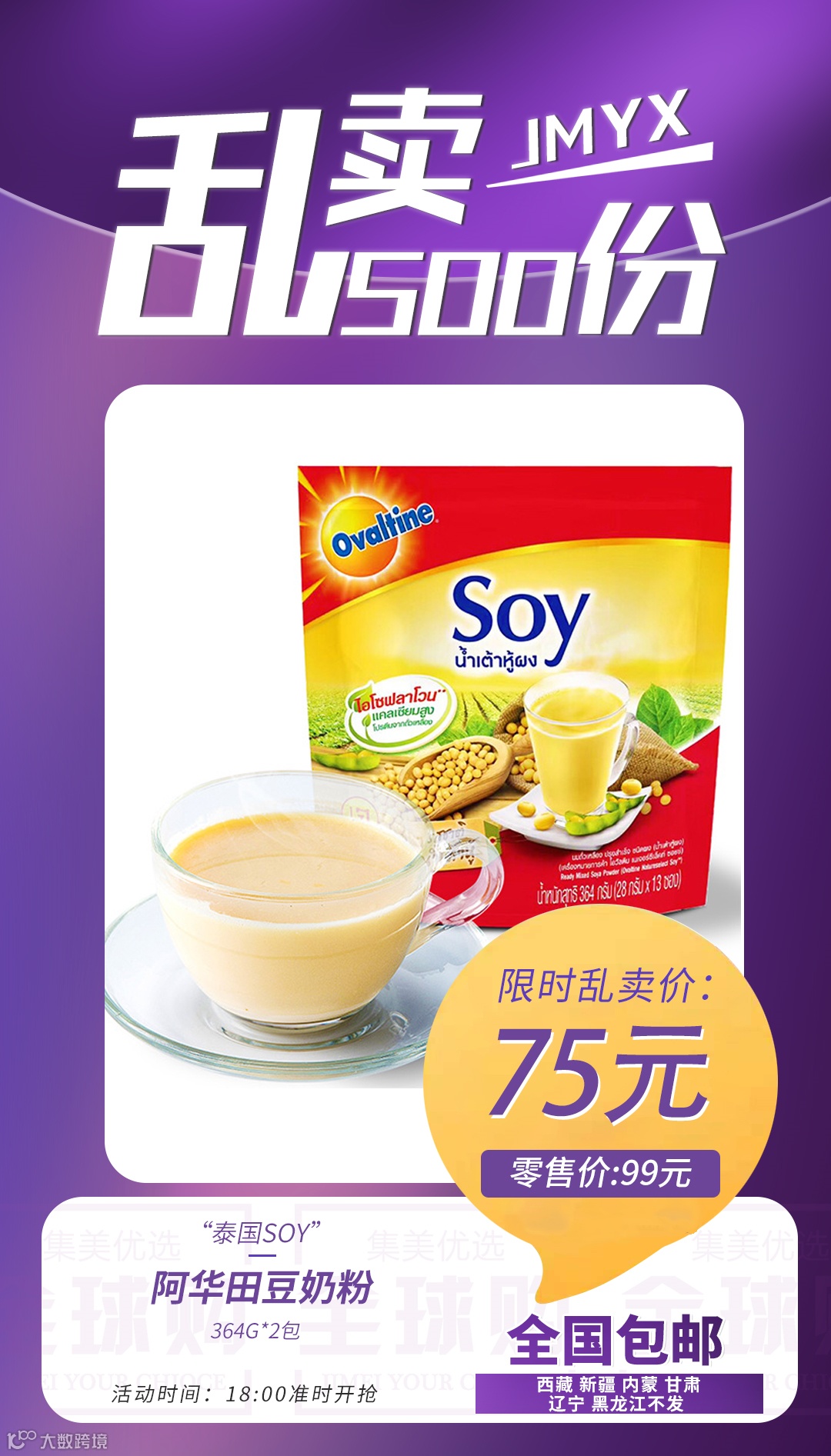 【乱卖500份】泰国Soy阿华田豆奶粉 364g*2包 原价:99元 粉丝群补贴价:75元