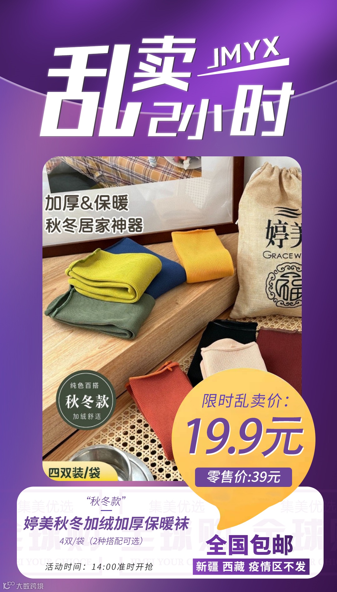 【乱卖2小时】婷美秋冬加绒加厚保暖袜4双/袋(2种搭配可选) 原价:39元 粉丝群补贴价:19.9元