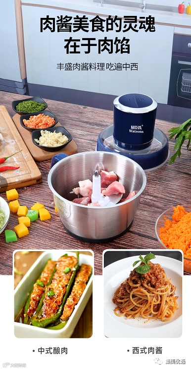 产品特点:内部双层四刀,每一片都采用8度黄金弯曲角度,可以全方位进行切割快慢双速,纯铜电机,快档绞菜类,慢档绞肉。