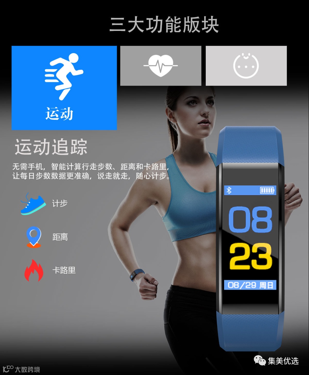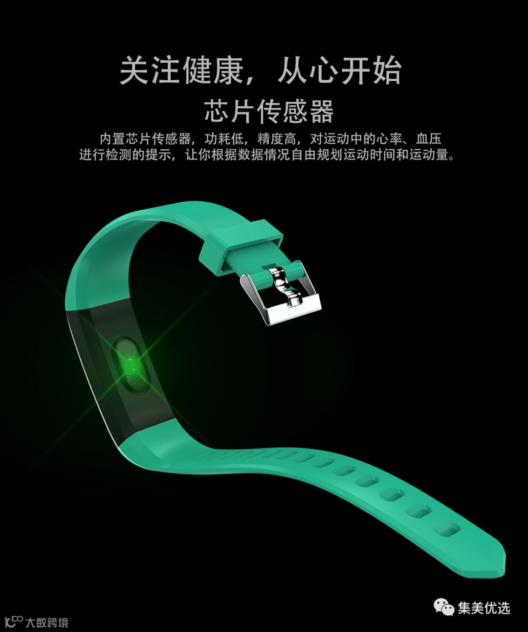 内置芯片传感器,功耗低,精度高,对运动中的心率、血压等进行检测,让你根据数据情况自由规划运动时间和运动量