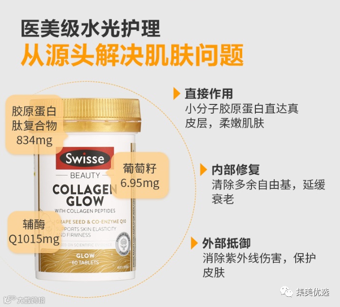 Swisse水光胶原蛋白肽亮肤精华片,1粒浓缩5大美肤成分,含有葡萄籽精华和辅酶,帮助形成胶原蛋白,美白肌肤,保持肌肤弹性和紧致,抗初老,减少自由基对细胞的伤害。还含有vc、ve,帮助抗氧化淡斑美白,让你由内而外焕发光彩!