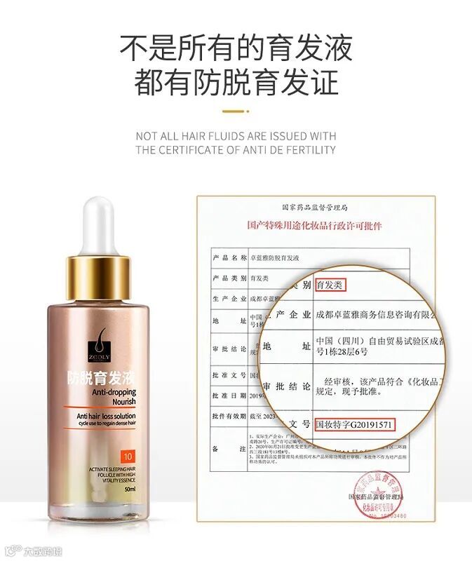 卓蓝雅防脱育发液具有育发类特殊用途化妆品行政许可批件,持证防脱,产品更值得信赖,生发效果看得见!