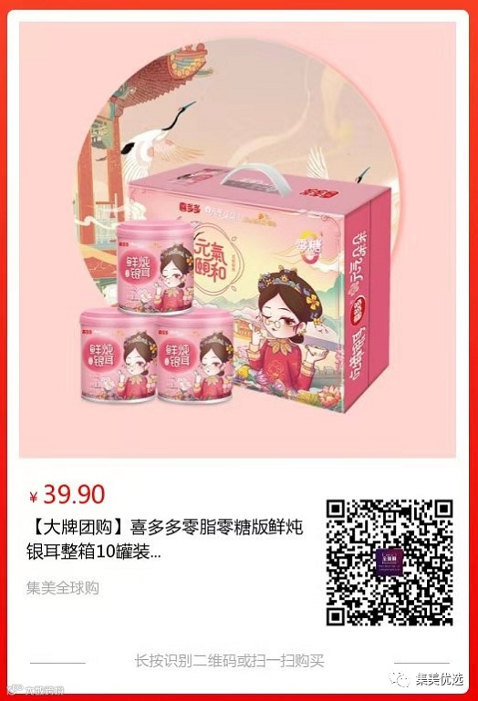 【大牌团购】喜多多 零脂零糖版鲜炖银耳整箱10罐装 200克*9罐+1罐鲜炖莲子 原价:64元 SVIP福利补贴价:39.9元 银耳大家都有吃过,