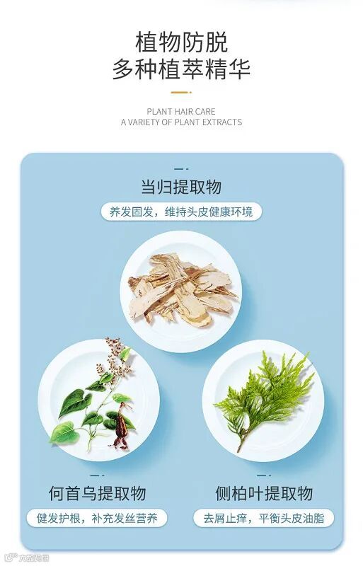 当归提取物,为毛囊补充营养,育发密发。侧柏叶提取物,滋养发根,保持毛囊活力,长出新发。何首乌提取物,修护枯萎毛乳头,促进新发长出。