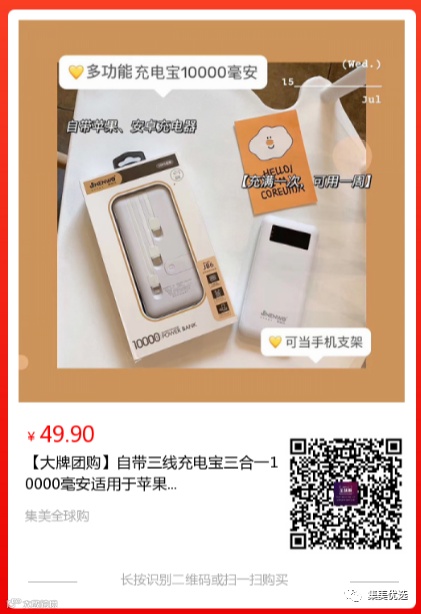 【大牌团购】自带三线充电宝三合一10000毫安 原价:89元 大牌团购价:49.9元 小巧充电宝10000毫安,