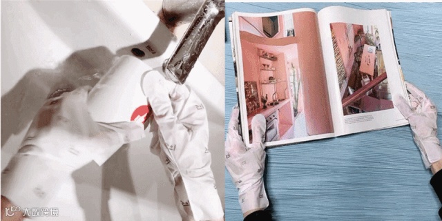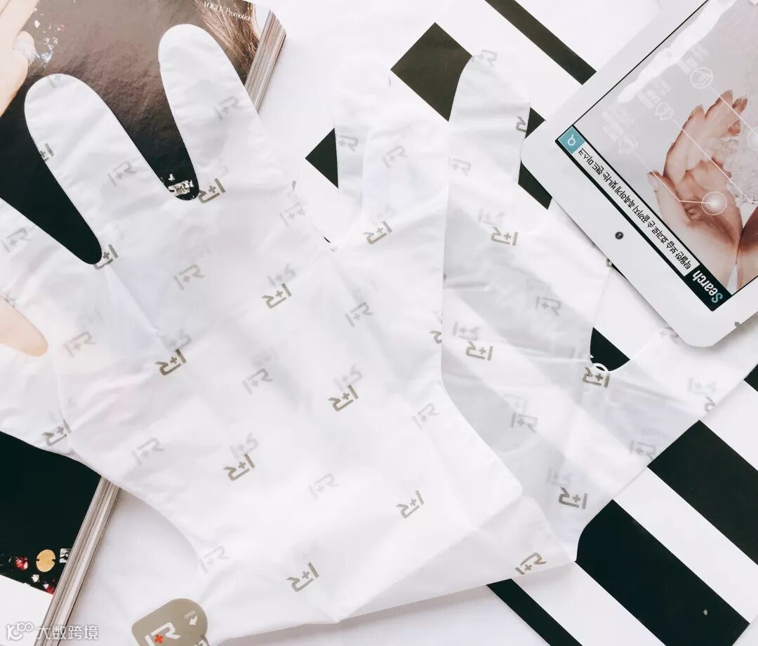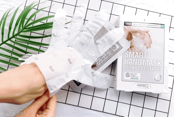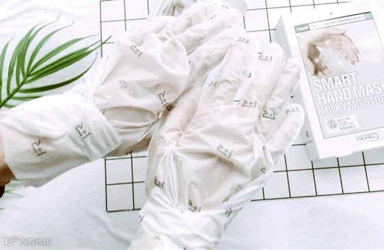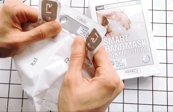 带上手膜开始享受羊奶SPA,按左右手分别套在干净的双手上,将最边上的便利纸揭开,包住手腕固定,不会漏掉精华