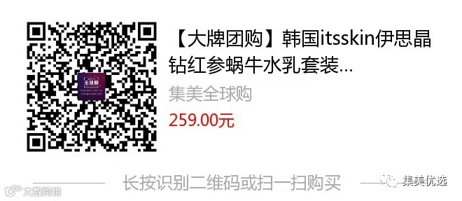 【大牌团购】韩国its skin伊思晶钻红参蜗牛水乳套装 原价:279元 VIP /黑卡M1会员 福利补贴价:259元 伊思这个品牌在韩国可谓是家喻户晓,主打蜗牛修复产品。红参蜗牛系列更是其中的高端系列,红参是参的熟用品,其加工方法是经过浸润、清洗、分选、蒸制、晾晒、干等工序加工而成干燥后的红参颜色红润,气味浓香,具有补气、滋阴、生津、健胃、镇静等作用。红参在蒸制过程中,因为热处理会发生化学反应,成分上发生变化并且生成水参及白参不惧有的新的成分。