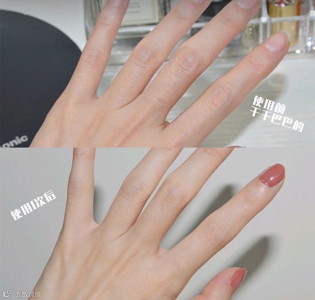 自然发热15-20分钟,精华液被完全吸收,双手拿出来,像喝饱了羊奶,白白嫩嫩的,手指倒刺、虎口上的干纹通通隐形