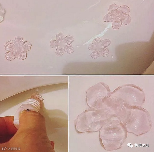 使用方法也非常简单,贴着马桶壁按压瓶身,就会在马桶内壁上形成一朵小花。
