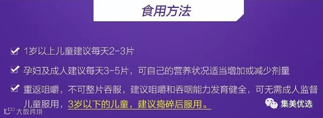 使用方法:1岁以上儿童建议每天2-3片,孕妇及成人建议每天3-5片,可自己的营养状况适当增加或减少剂量。充分咀嚼,不可整片吞服。
