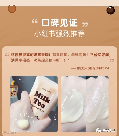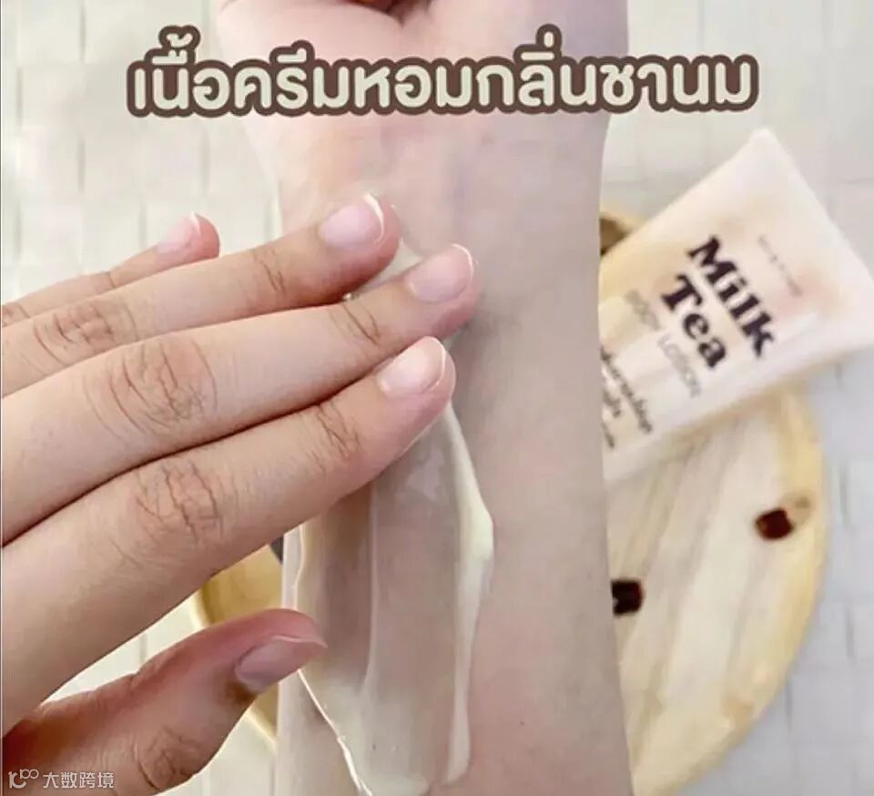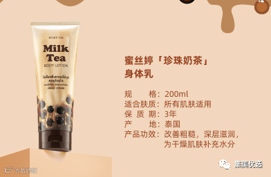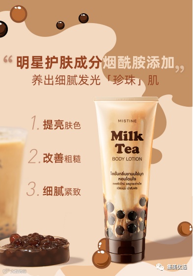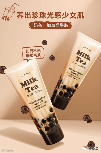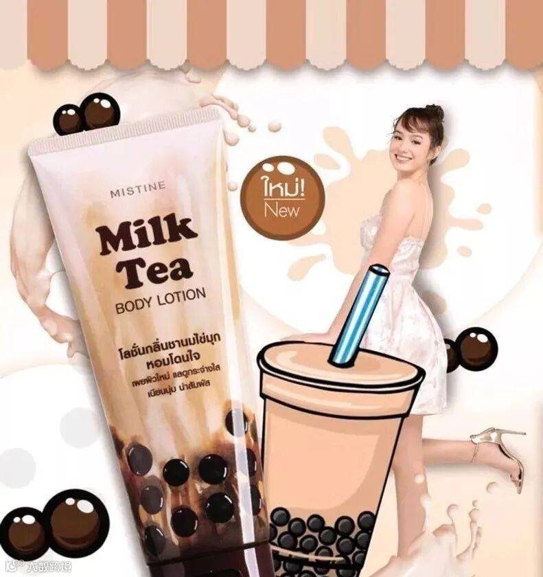 mistine奶茶身体乳,带有红茶抗氧化成分,以及醋酸生育酚的营养成份,富含牛乳蛋白和维生素b3可补充肌肤的营养成份,滋润营养全身肌肤,神奇的奶茶味道。