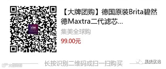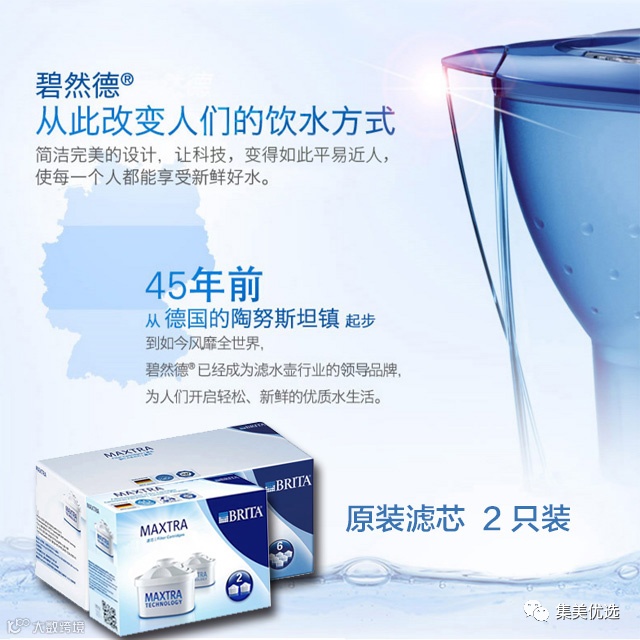 【大牌团购】Brita碧然德Maxtra二代滤芯 2只装 原价:159元 VIP /黑卡M1会员 福利补贴价:95元 人体每天消耗的水分中,约有一半需要直接喝饮用水来补充,其他部分从饭食中直接获得,少部分由体内的碳水化合物分解而来。成人每天大约需要补充水分1200毫升左右。 这款德国原装进口的碧然德滤芯,让你提高生活品质,喝到健康饮用水!