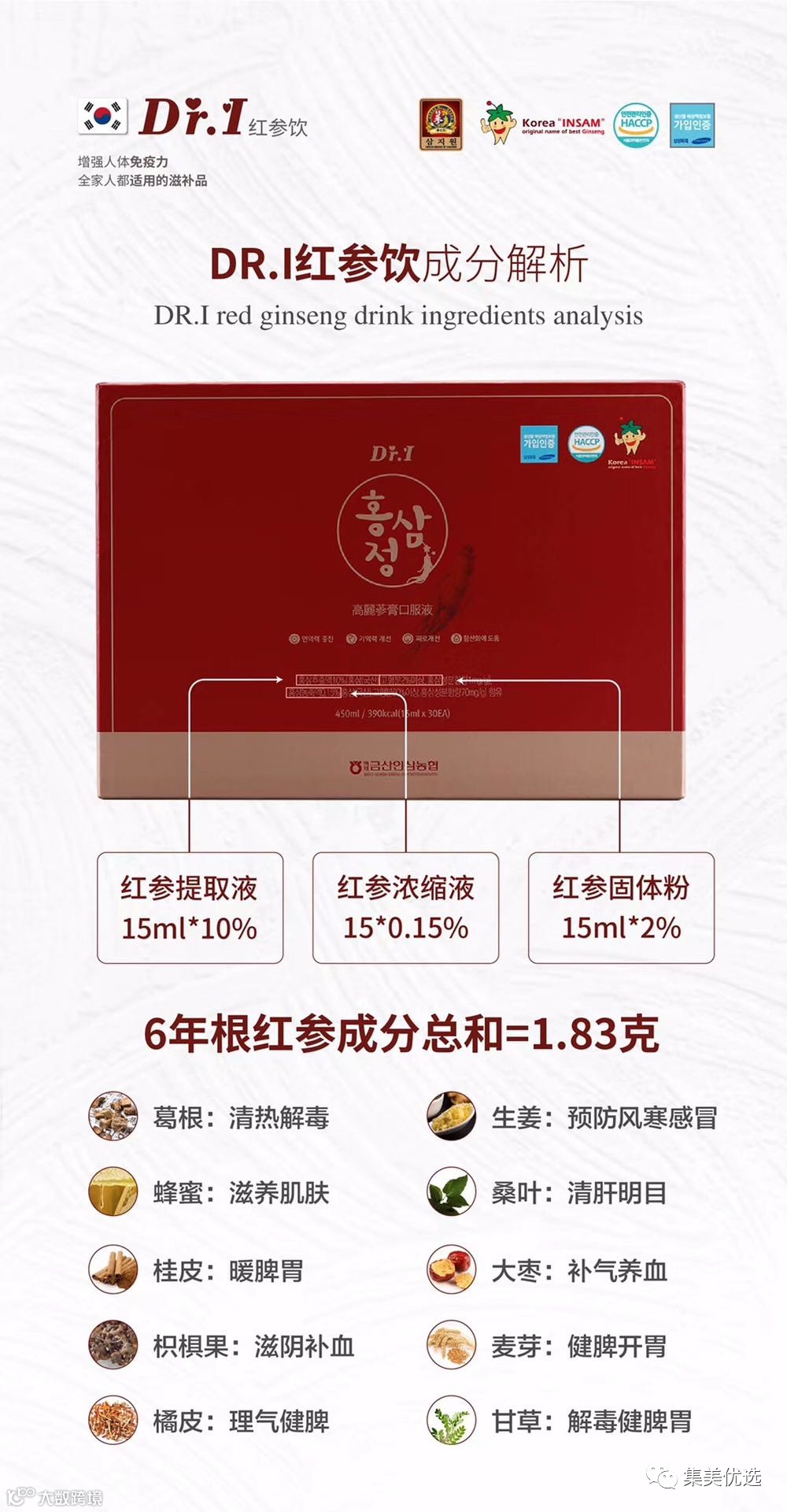 不仅采用了拥有1500年种植历史的锦山高丽人参且选用拥有皂苷含量最足的六年根参