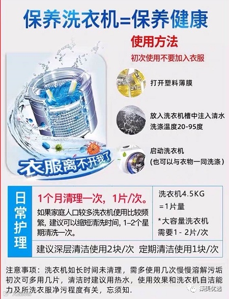 只需在洗衣机槽里加2块“清洁片”