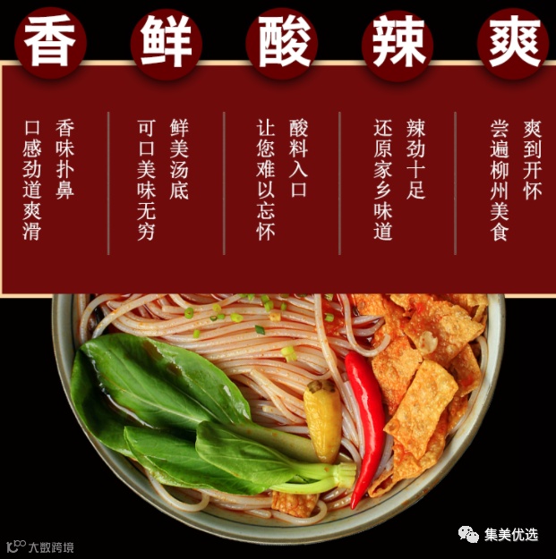 柳州螺蛳粉具有“酸、辣、鲜、爽、烫”的独特风味,由柳州特有的软滑爽口的米粉,加上酸笋、木耳、花生米、油炸腐竹、萝卜干、黄花菜、鲜嫩青菜等配料及浓郁适度的酸辣味和煮烂螺蛳的汤水调合而成。
