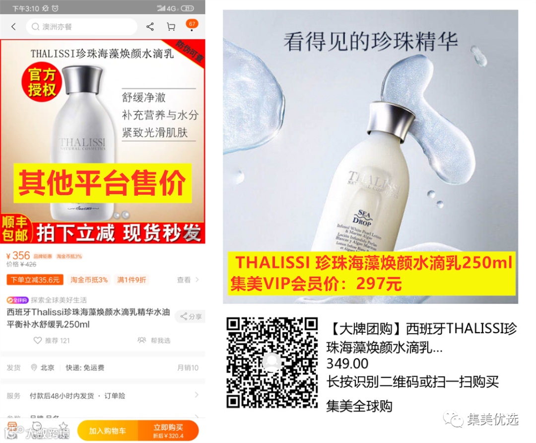 【大牌团购】西班牙 THALISSI 珍珠海藻焕颜水滴乳250ml 团购价:349元 VIP /黑卡M1会员 福利补贴价:297元