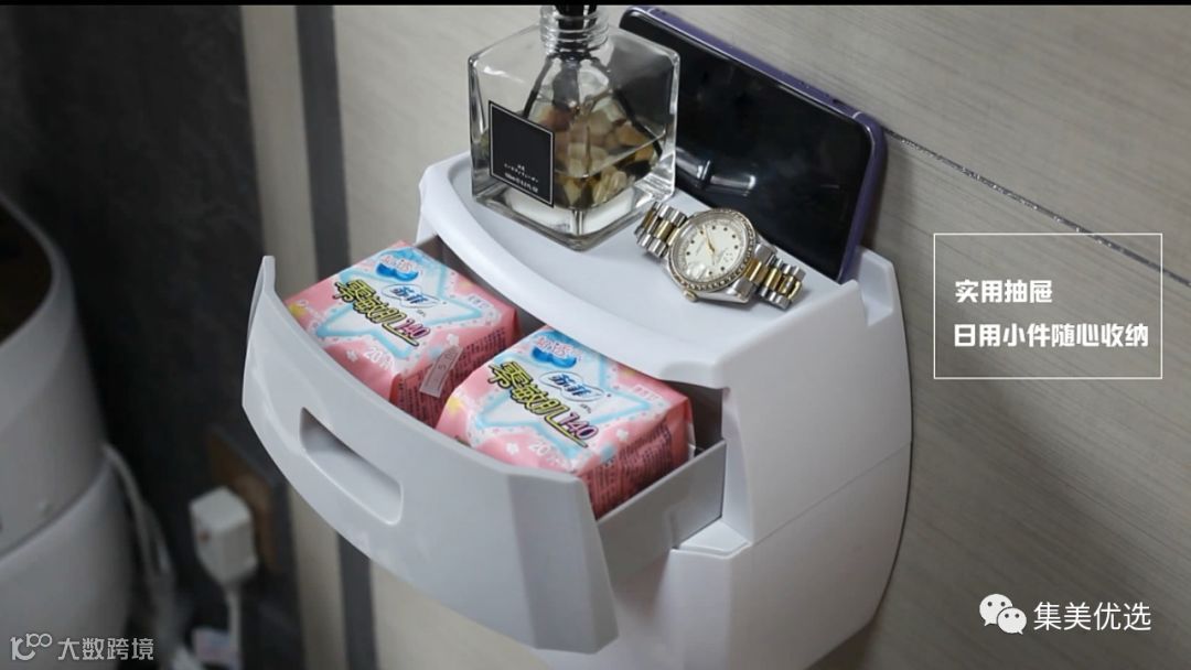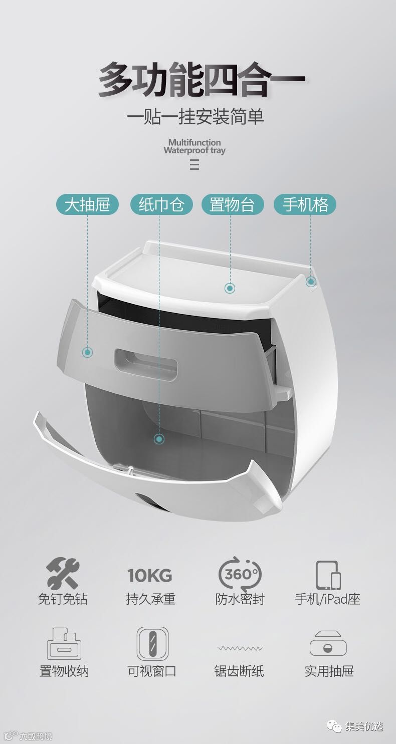 实用抽屉日用小聊随心收纳。透明可视窗,剩余纸量清晰可见横竖都好放竖放听歌横放追剧免打孔安装,一贴一挂安装简单多功能四合一,大抽屉纸巾仓置物台,手机格