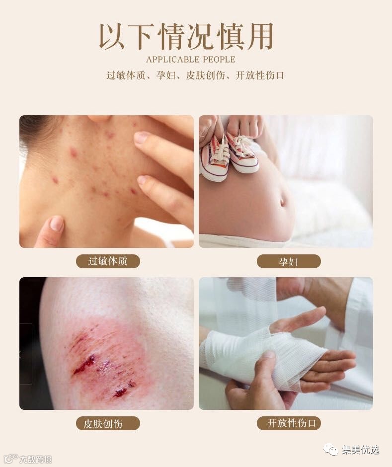注意:过敏体质。孕妇,皮肤创伤,开放性伤口慎用!