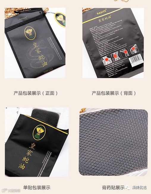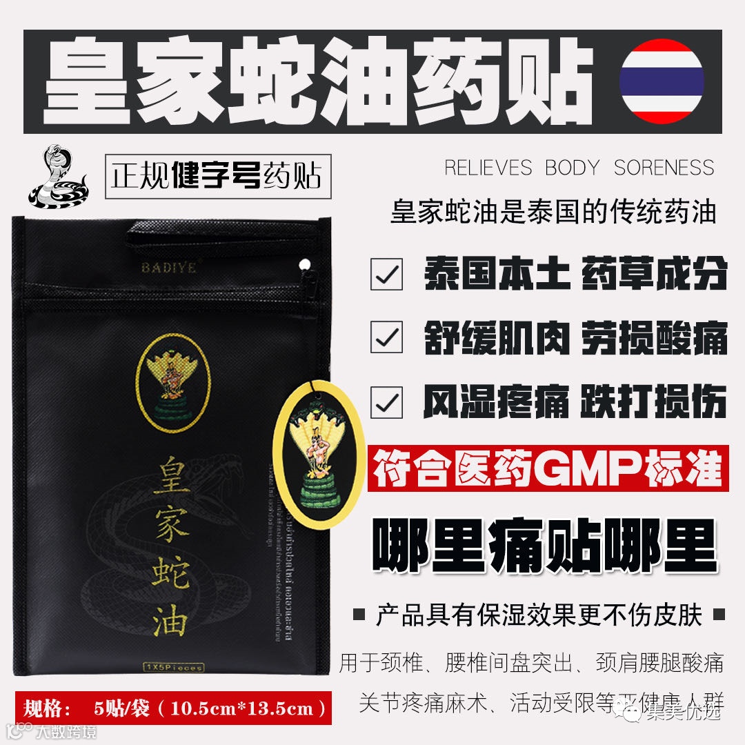 皇家蛇油颈肩腰腿痛保健贴一包有5贴,是泰国本土品牌,里面有多种药草,可以帮助舒缓肌肉酸痛,风湿疼痛,腰椎间盘突出等,在泰国当地非常有名。